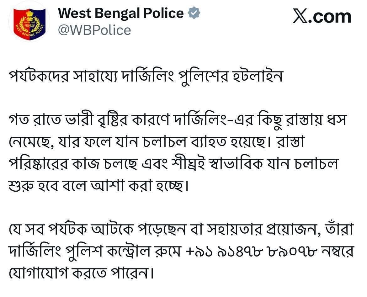 আবহাওয়া দপ্তর শনিবারই দার্জিলিং-সহ উপ-হিমালয়ান (sub-Himalayan) জেলাগুলির জন্য লাল সতর্কতা জারি করেছিল। কালিম্পং, কোচবিহার, জলপাইগুড়ি ও আলিপুরদুয়ারেও জারি করা হয়েছে ভারী বৃষ্টির সতর্কতা। রবিবারের জন্য আলিপুরদুয়ারে জারি রয়েছে লাল সতর্কতা, আর দার্জিলিং, কালিম্পং, কোচবিহার ও জলপাইগুড়িতে রয়েছে কমলা সতর্কতা।