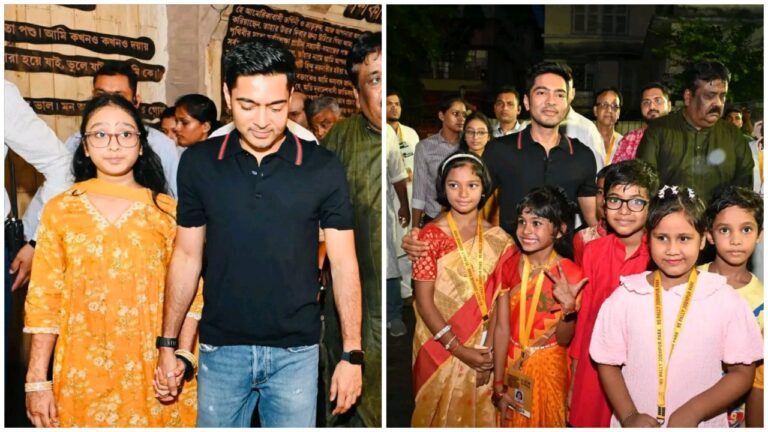 মহানবমীতেও কলকাতায় প্যান্ডেল হপিং অভিষেকের, সঙ্গী কন্যা