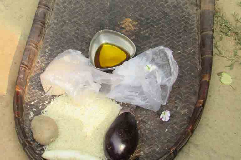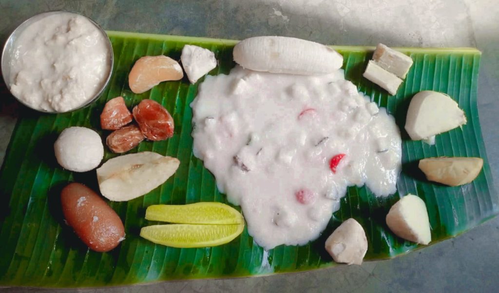 - সকালে পুজোর পর নতুন চালের গুঁড়ো /সেদ্ধ চাল মাখার জন্য দুধ, চিনি, কিসমিস, ফলের টুকরো, মিষ্টি।