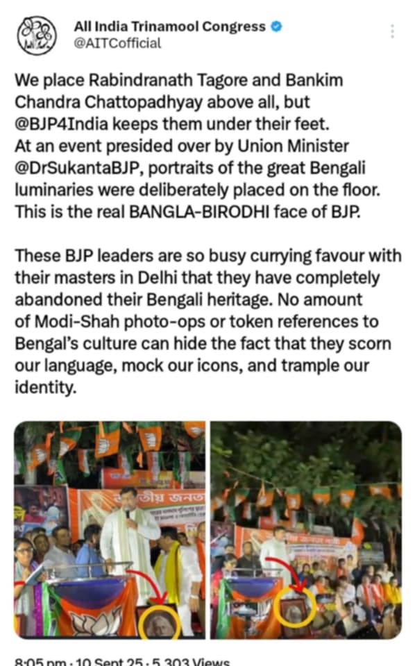 শাসকদলের বক্তব্য, “আমরা রবীন্দ্রনাথ ঠাকুর ও বঙ্কিমচন্দ্র চট্টোপাধ্যায়কে সর্বোচ্চ আসনে রাখি। কিন্তু বিজেপি তাঁদের পায়ের কাছে রাখে। সুকান্ত মজুমদার একটি অনুষ্ঠানে সাবলীলভাবে রবীন্দ্রনাথের ছবি মঞ্চে পায়ের কাছে রেখে দিলেন। এটাই বিজেপির আসল বাংলা-বিরোধী চেহারা। ভাষা থেকে শুরু করে বাংলার ঐতিহ্য—সবকিছু ধ্বংসের চেষ্টা করছে ওরা।”