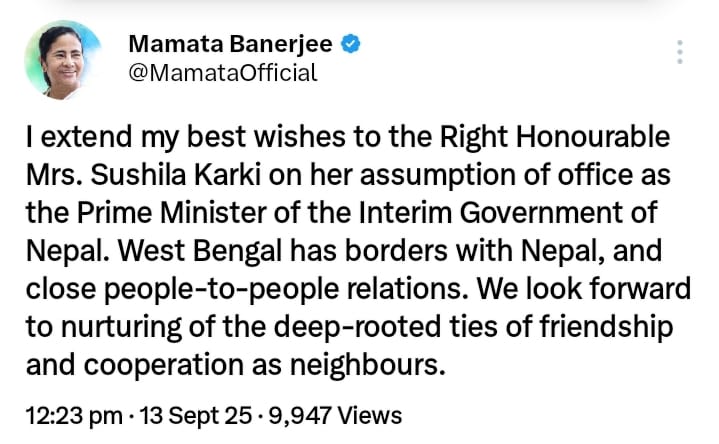 বাংলার সঙ্গে নেপালের সীমান্ত ভাগাভাগির প্রসঙ্গ টেনে মুখ্যমন্ত্রী তাঁর এক্স হ্যান্ডেলে লিখেছেন, “নেপালের অন্তর্বর্তী সরকারের প্রধানমন্ত্রী হিসেবে দায়িত্ব গ্রহণের জন্য মাননীয়া সুশীলা কার্কিকে আন্তরিক শুভেচ্ছা জানাই। পশ্চিমবঙ্গের নেপালের সঙ্গে সীমান্ত রয়েছে এবং মানুষের সঙ্গে মানুষের নিবিড় সম্পর্কও আছে। প্রতিবেশী হিসেবে বন্ধুত্ব ও সহযোগিতার এই গভীর সম্পর্ক আরও সুদৃঢ় হোক, সেই প্রত্যাশা করি।”