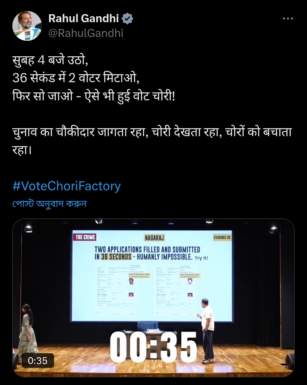 রাহুলের অভিযোগ, কমিশন আসলে “ভোটচোরদের” পাহারা দিচ্ছে। তিনি এক্স-এ লিখেছেন, “ভোর ৪টেয় ওঠো, ৩৬ সেকেন্ডে দু’জন ভোটারের নাম কেটে দাও, আবার ঘুমোতে যাও। এভাবেই হয়েছে ভোটচুরি! নির্বাচনের কুকুরদার (watchdog) জেগে থেকেও চোরেদের পাহারা দিয়েছে।”