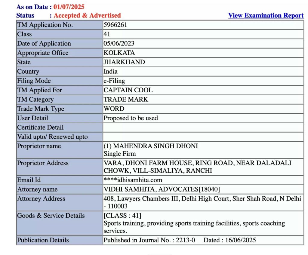 পোর্টালে ‘খেলার অনুশীলন, কোচিং ও পরিকাঠামো’ শীর্ষক ক্যাটাগরিতে ১৬ জুন ধোনির আবেদন নথিভুক্ত হয়। ধোনি আবেদন করেন ৫ জুন। এতেই জল্পনা তিনি কি কোনও সংস্থা বা ক্যাম্প খুলতে চলেছেন? হয়ত সেই সংস্থার নাম হবে তাঁর ভালবাসার নামে। উল্লেখ্য, এই একই নাম নিয়ে আরও একটি সংস্থা আর্জি জানিয়েছে। এখন দেখার ট্রেডমার্ক কার ঝুলিতে যায়।