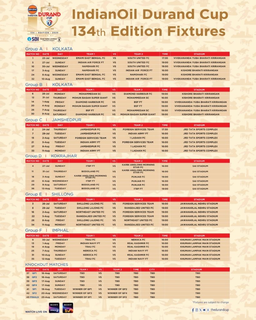১৩৪তম ডুরান্ড কাপের সূচি প্রকাশিত। ইস্টবেঙ্গল ও মোহনবাগান গ্রুপ পর্বে মুখোমুখি নয়, তবে নকআউটে দেখা যেতে পারে ঐতিহাসিক ডার্বি।