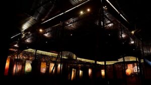 হাতিবাগান সর্বজনীন দুর্গোৎসবের এবারের থিম, ‘অথঃ ঘাট কথা’। ফরাসি শিল্পী তমাস অঁরিয়েতের সঙ্গে বাঙালি শিল্পীরা হাতে হাত মিলিয়ে তৈরি করেছে মণ্ডপ।