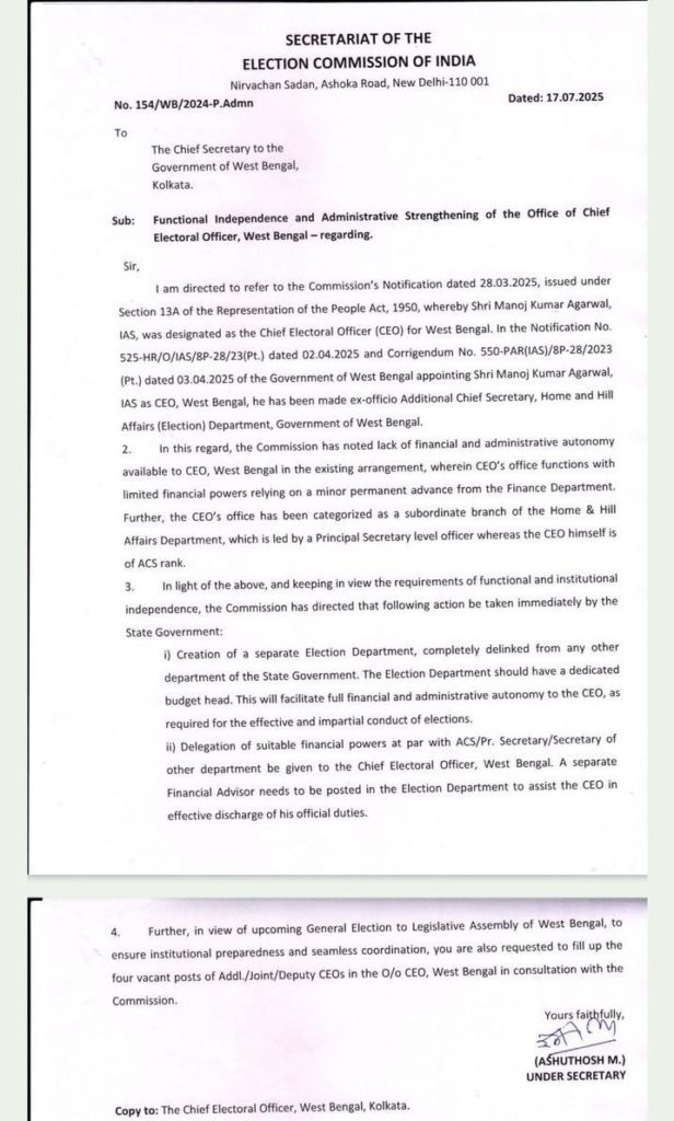 রাজ্যের মুখ্য নির্বাচনী আধিকারিকের দপ্তরকে রাজ্য সরকারের অধীন থেকে স্বতন্ত্র করতে চেয়ে মুখ্য সচিব মনোজ পন্থকে চিঠি দিল জাতীয় নির্বাচন কমিশন।