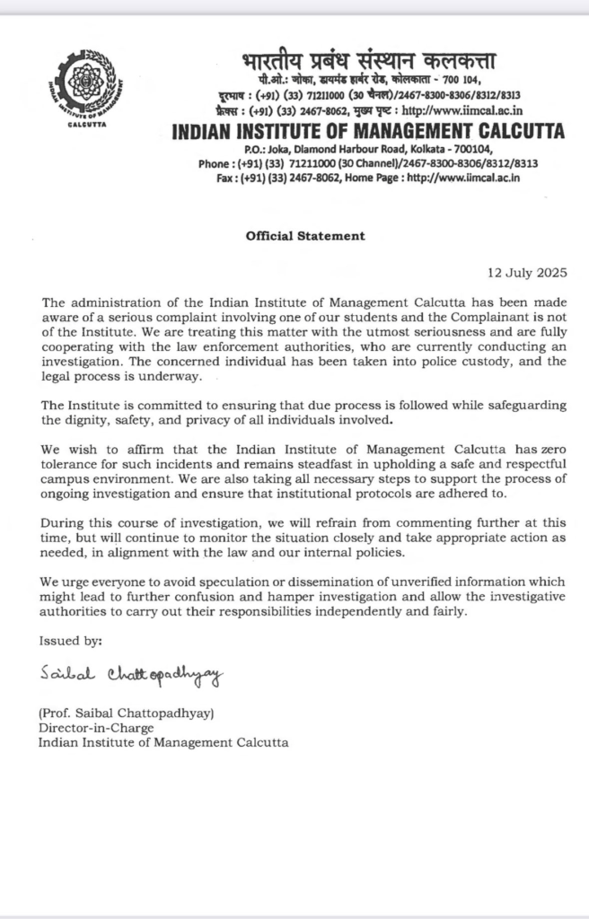 নিউজ ডেস্ক, দৃষ্টিভঙ্গি, ১৫:৫১: কলকাতা পুলিশের তরফে আইআইএম কলকাতার (IIM Calcutta) হোস্টেলে এক ছাত্রীর উপর ধর্ষণের তদন্তে তৈরি করা হয়েছে SIT। রবিবার পুলিশ জানিয়েছে, এই মামলার তদন্তের জন্য ৯ সদস্যের একটি বিশেষ তদন্তকারী দল (Special Investigation Team – SIT) গঠন করা হয়েছে। দক্ষিণ-পশ্চিম বিভাগের ডেপুটি কমিশনার (DC Southwest Division) নিজেই এই দলের নেতৃত্বে রয়েছেন।