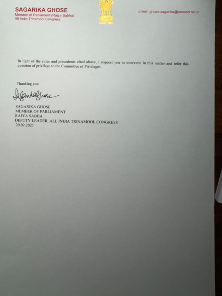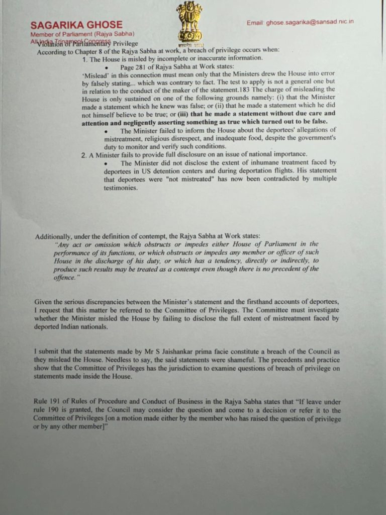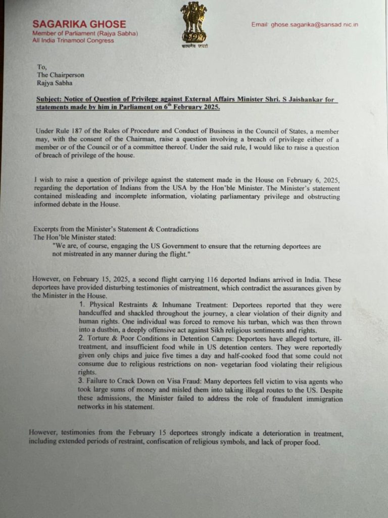 আমেরিকার সেনার বিমানে কেন ভারতীয়দের সঙ্গে অমানবিক আচরণ করা হল, কেন আমেরিকার সেনার বিমানকে ভারতের মাটিতে নামতে দেওয়া হল, ভারত কেন নিজের বিমান পাঠিয়ে সসম্মানে সকলকে ফিরিয়ে আনল না, প্রশ্ন ওঠে। রাজ্যসভার তৃণমূল সাংসদ সাগরিক ঘোষ বিদেশমন্ত্রীর বিরুদ্ধে স্বাধিকার ভঙ্গের নোটিশ আনেন। ২০ ফেব্রুয়ারি তারিখে তিনি রাজ্যসভার চেয়ারম্যান চিঠি লেখেন, বিদেশমন্ত্রীর ৬ ফেব্রুয়ারি তারিখের বক্তব্যের প্রেক্ষিতে আনা হয় নোটিশ। প্রসঙ্গত, রাজ্যসভার ১৮৭ নম্বর রুল অনুযায়ী সাংসদ সদস্যের স্বধিকার ভঙ্গের অভিযোগ করা হয়। সাগরিকার অভিযোগ, অভিবাসী ফেরত সংক্রান্ত ইস্যুতে সংসদে দাঁড়িয়ে বিদেশমন্ত্রীর ভাষণ বিভ্রান্তিকর ও অসম্পূর্ণ।
