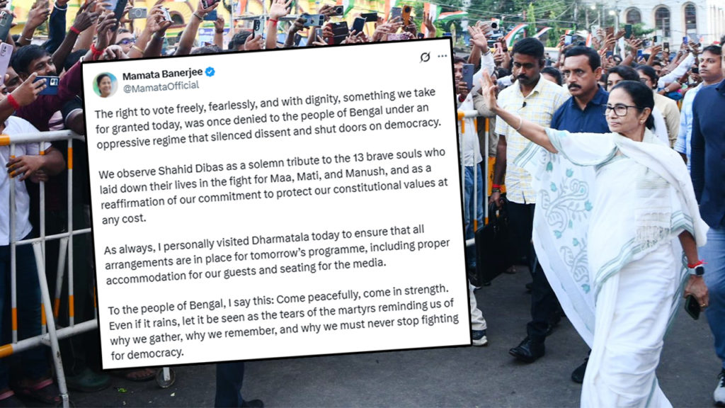 “ধর্মতলায় বাংলার সকল মা-মাটি-মানুষকে আমার সাদর আমন্ত্রণ রইল। আসুন, মহান শহিদ তর্পণে অংশ নিন এবং একুশে জুলাইয়ের সমাবেশকে সাফল্যমণ্ডিত করুন।”