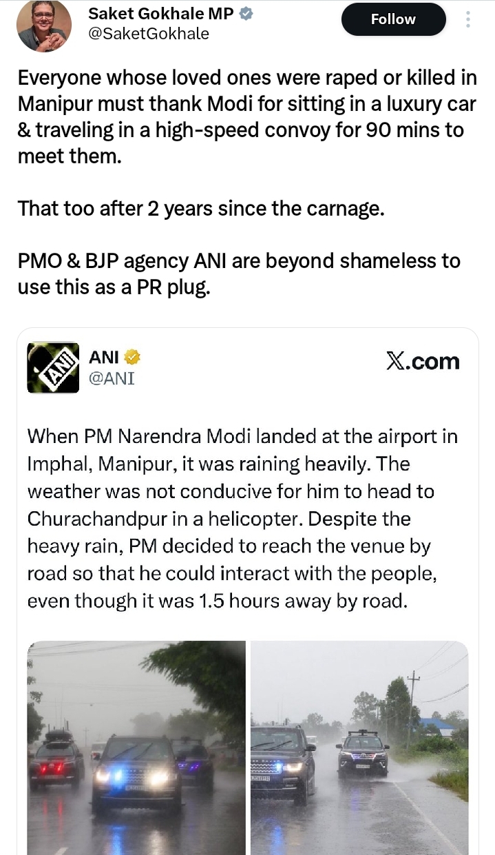 তৃণমূল সাংসদ সাকেত গোখলে এক্স হ্যান্ডেলে লিখেছেন, “যাঁদের প্রিয়জনদের মণিপুরে ধর্ষণ করা হয়েছে বা হত্যা করা হয়েছে, তাঁদের সবাইকে ধন্যবাদ দিতে হবে মোদীকে-কারণ তিনি বিলাসবহুল গাড়িতে চেপে, হাই-স্পিড কনভয়ে চড়ে ৯০ মিনিট সময় নিয়ে তাঁদের সঙ্গে দেখা করতে গিয়েছেন। তাও আবার হত্যাযজ্ঞের দু’ বছর পর। প্রধানমন্ত্রীর দপ্তর আর বিজেপির এজেন্সি এএনআই-এর পক্ষে এটিকে পাবলিক রিলেশনস-র প্রচারে ব্যবহার করা সত্যিই লজ্জাজনক।”
