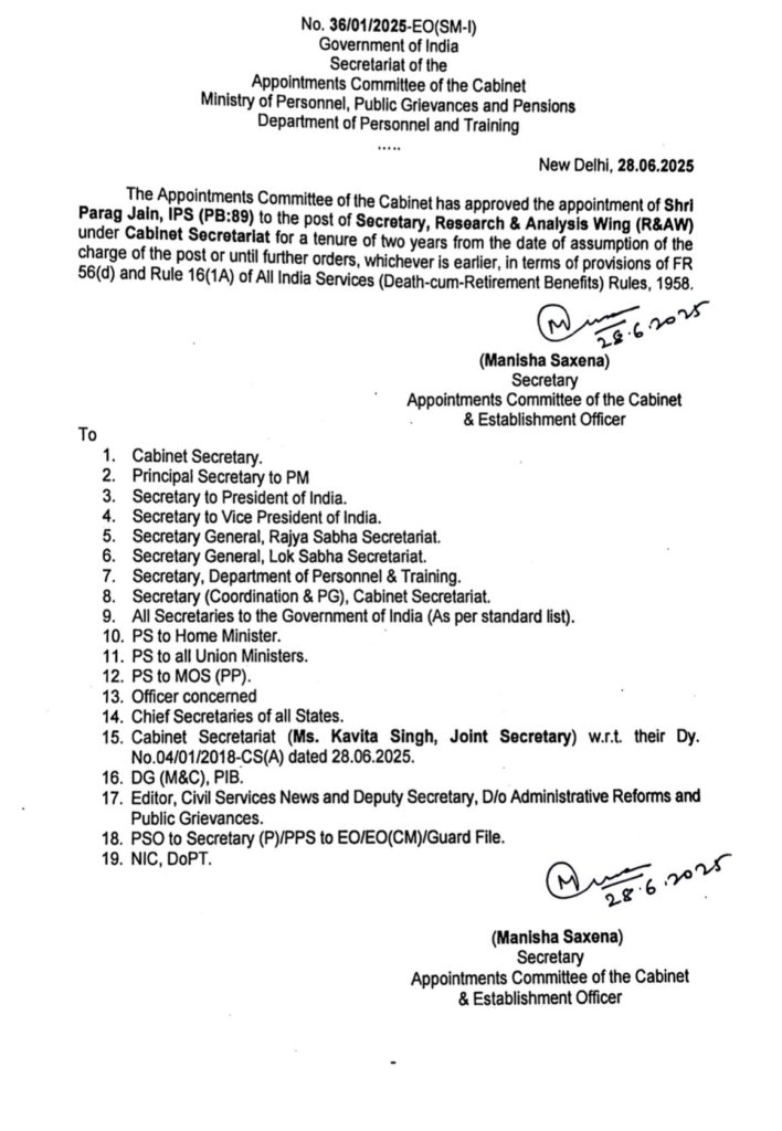 শনিবার সরকারিভাবে জানানো হয়েছে, ১ জুলাই থেকে দায়িত্ব নেবেন পরাগ জৈন। তাঁর নাম সুপারিশ করেছেন স্বয়ং প্রধানমন্ত্রী নরেন্দ্র মোদী। কেন্দ্রীয় মন্ত্রিসভার নিয়োগ সংক্রান্ত কমিটির তরফেও তাঁর নিয়োগে সিলমোহর পড়েছে। বর্তমানে তিনি RAW-এর অধীনস্থ আকাশপথ নজরদারি ইউনিট ‘অ্যাভিয়েশন রিসার্চ সেন্টার’-এর প্রধান হিসেবে কর্মরত।