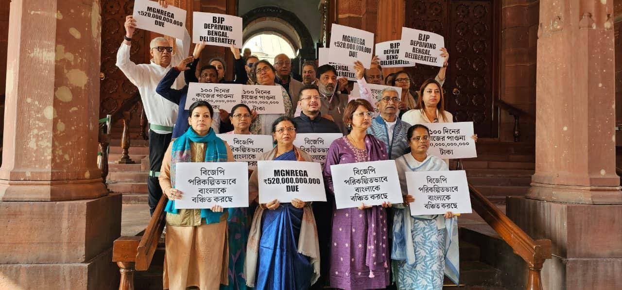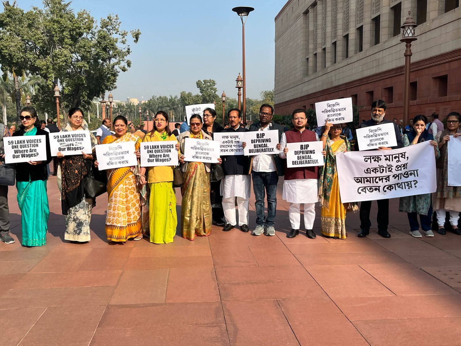 ১১:০৯ : একশো দিনের কাজের বকেয়া টাকার দাবিতে সংসদ চত্বরে বিক্ষোভ দেখাল তৃণমূল সাংসদরা।