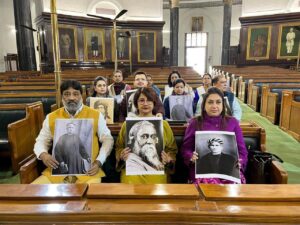 ১১:০২ বাংলার মনীষীদের অপমানের প্রতিবাদে রবীন্দ্রনাথ, বঙ্কিমচন্দ্রের ছবি নিয়ে সেন্ট্রাল হলে মৌন প্রতিবাদ তৃণমূল সাংসদদের।