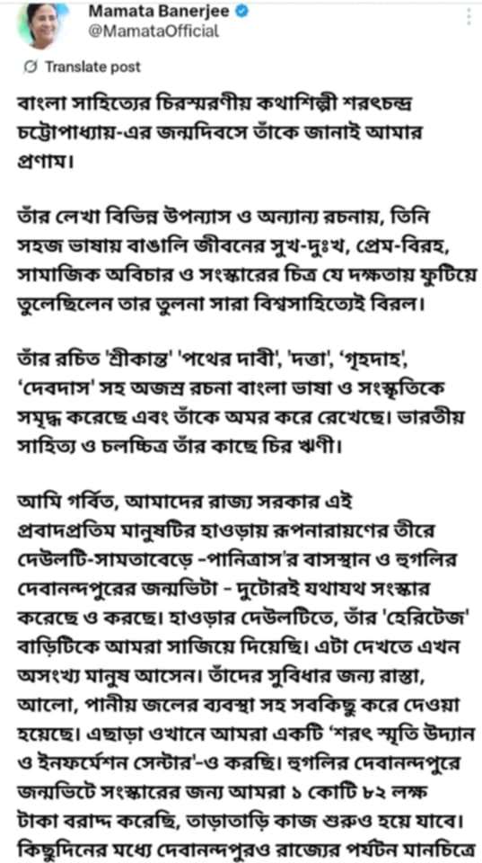 মমতা বন্দ্যোপাধ্যায় লেখেন, “বাংলা সাহিত্যের চিরস্মরণীয় কথাশিল্পী শরৎচন্দ্র চট্টোপাধ্যায়-এর জন্মদিবসে তাঁকে জানাই আমার প্রণাম। তাঁর লেখা বিভিন্ন উপন্যাস ও অন্যান্য রচনায়, তিনি সহজ ভাষায় বাঙালি জীবনের সুখ-দুঃখ, প্রেম-বিরহ, সামাজিক অবিচার ও সংস্কারের চিত্র যে দক্ষতায় ফুটিয়ে তুলেছিলেন তার তুলনা সারা বিশ্বসাহিত্যেই বিরল।” তিনি আরও জানান, “ভারতীয় সাহিত্য ও চলচ্চিত্র তাঁর কাছে চির ঋণী।”