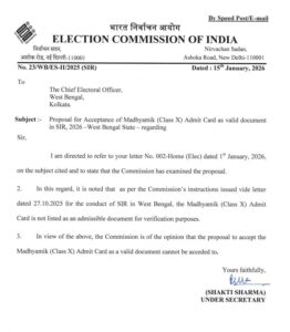 কমিশন জানিয়েছে, ২০২৫ সালের ২৭ অক্টোবর জারি করা নির্দেশিকায় ভোটার তালিকা সংশোধনের সময় যে নথিগুলিকে বৈধ হিসেবে ধরা হয়েছে, তাতে মাধ্যমিকের অ্যাডমিট কার্ড নেই। সেই প্রস্তাব গ্রহণ করা সম্ভব নয় বলে মত নির্বাচন কমিশনের।