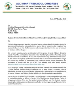 সংবাদমাধ্যমের প্রতিনিধিদের সামনে কিছুদিন আগেই শুভেন্দু বলেন, ‘‘বিহারের ৫২ জন BLO কিন্তু এখনও জামিন পাননি। আপনাদের কিন্তু জেলে কাটাতে হবে। জেলে যাওয়ার জন্য তথ্য-নথি আমরা জোগাড় করে দেব।’’ এরপরই সরব হয় তৃণমূল। শুভেন্দুর বিরুদ্ধে BLO-দের ভয় দেখানোর অভিযোগ এনে শুক্রবার রাতে কমিশনে চিঠি পাঠায় তৃণমূল।