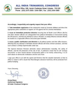 তৃণমূলের দাবি, বিরোধী দলনেতার মন্তব্যের বিরুদ্ধে অবিলম্বে পদক্ষেপ করতে হবে। পুলিশকে FIR নির্দেশ দিতে হবে। সকল BLO এবং অন্য নির্বাচনী আধিকারিক যাতে রাজনৈতিক ভয়, হুমকি থেকে রেহাই পান, তা সুনিশ্চিত করতে দ্রুত প্রতিরক্ষামূলক নির্দেশিকা জারি করতে হবে। বিজ্ঞপ্তি জারি করে কমিশনের তরফে সকল রাজনৈতিক দলকে বলে দিতে হবে, নির্বাচনী আধিকারিকদের ভয় দেখালে আইনানুগভাবে কী কী হতে পারে।